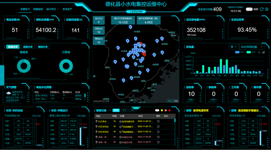 (二)集中控制,大力推進電站集約化運營。縣小水電協會牽頭與福建力得公司共同組建“德化縣小水電集控中心”,打造“一屏觀天下、一鍵全調度、一網控全域”的集控平臺。將經過智能化改造且條件成熟的小水電站整體接入,將小水電站生態下泄流量數據、安全生產設備信息也統一接入,實現生態流量與電站運行“一張網”,全縣已有34座水電站接入縣集控中心運營。